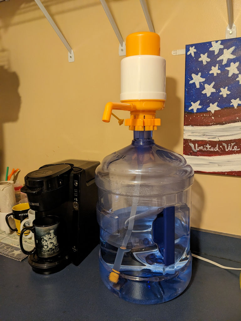 Our hi-tech water dispenser has been replaced by a hand-operated mechanical pump that uses air pressure to dispense the water. It’s not pretty…but it gets the job done and does not have recurring costs. It’s a $20.00 one and done investment!