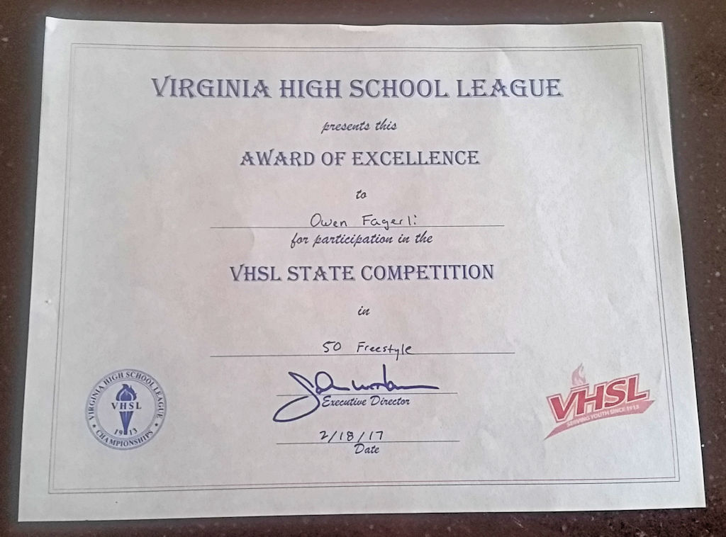 Owen went to the VHSL 5A Swim and Dive Championships again this year. He was the only member of the THS Boy’s Swim Team to make it to the state championships this year. He competed in the 50 Freestyle event. He also won the THS “Most Valuable Swimmer Award” for the 2016-2017 season.